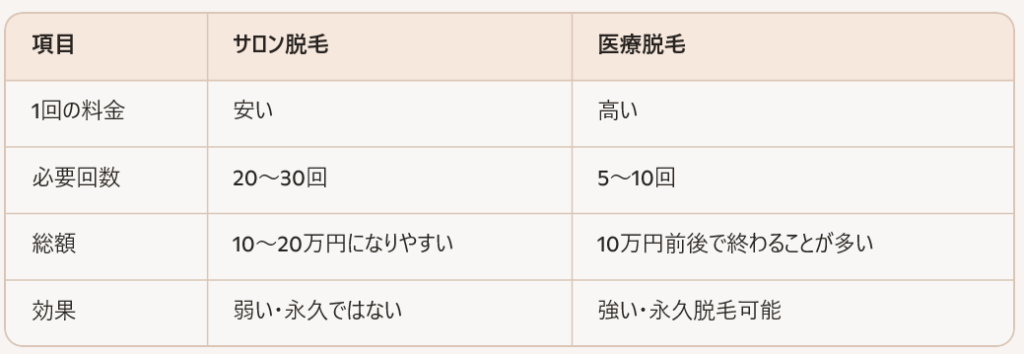 サロンと医療の費用比較|長期的には医療脱毛のほうがコスパが良い理由